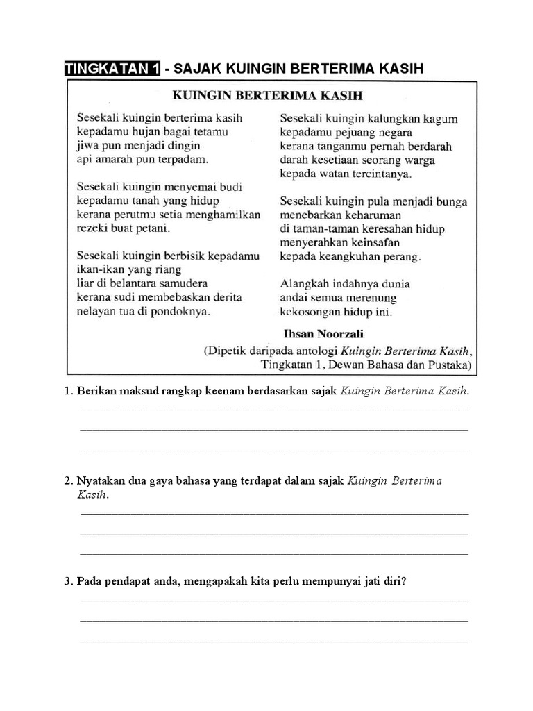 Contoh Soalan Komsas Tingkatan 1kuingin Berterima Kasih
